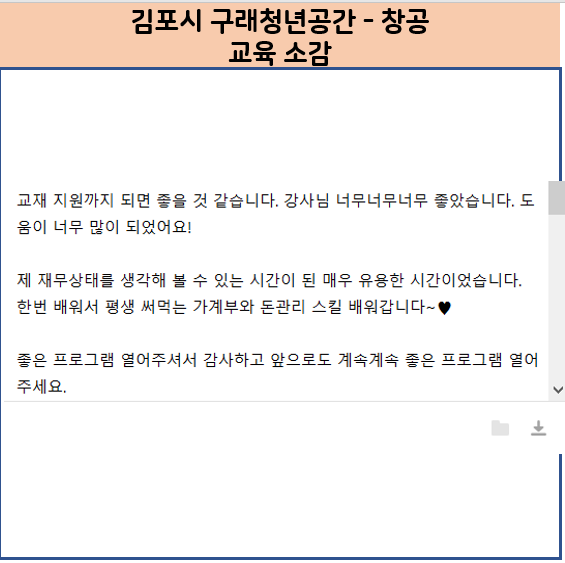 지난 6월엔 김포시의 [구래청년지원센터 창공] 에서 사회초년생 및 부부들을 대상으로 한 개인 재무관리 교육을 5회차에 걸쳐서 진행하였습니다.